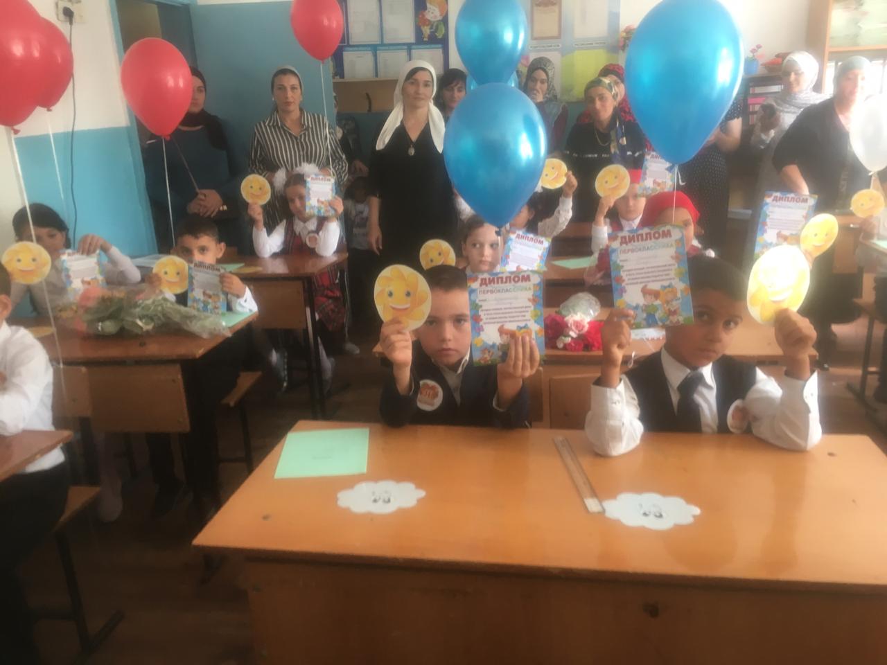 Торжественная линейка открылась гимнами РФ и ЧР, после которых директор школы поздравила всех с праздником и пожелала успехов в овладении знаниями. По традиции на праздник поздравить учителей, ребят и их родителей с началом учебного года пришли гости: Глава Администрации поселения и заведующая сельской библиотекой. Выступавшие пожелали школьникам новых успехов и свершений, неиссякаемого оптимизма и стремления быть достойными гражданами своей страны. 1 сентября – это праздник, поэтому учащиеся школы подготовили небольшие интересные номера, чтобы порадовать гостей. Учащиеся 4 классов по традиции исполнили песню, сказали напутственное слово первоклассникам, а те, в свою очередь, прочли стихотворения и дали клятву учиться прилежно, защищать честь школы. Традиционный «колокольчик»» дал начало новому учебному году. Право дать первый звонок предоставили первоклассникам. После окончания линейки под дружные аплодисменты первоклассники прошли на первый школьный праздник «Посвящение в первоклассники». Во 2-4 классах прошли Уроки Победы, посвященные 75 – летию Победы в ВОВ.