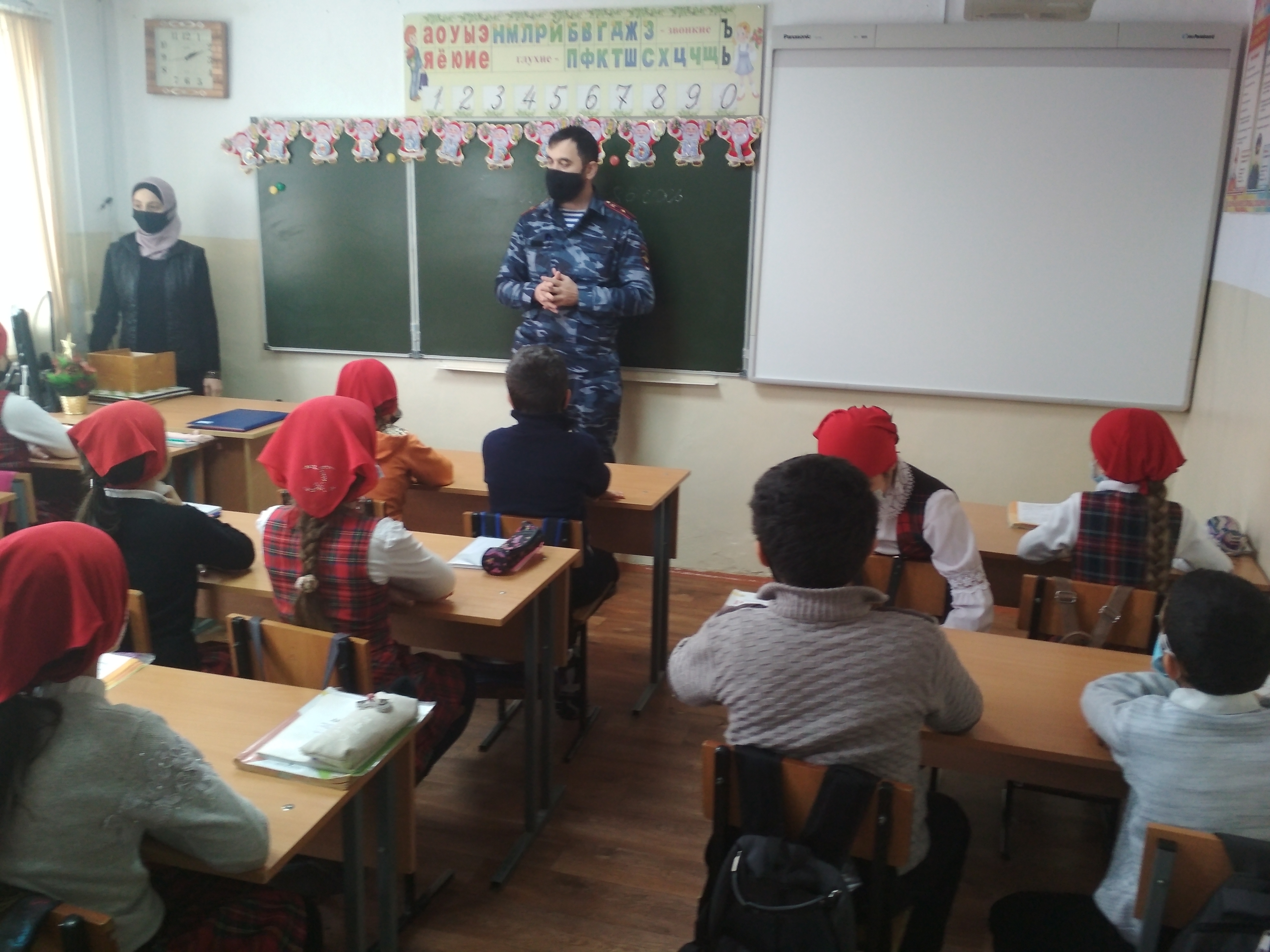 24.12.2020Майором полиции инспектором ПДН Эжаевым Умаром Висаевичем 24 декабря 2020 года проведены беседы с учащимися 1-4 классов на тему «Безопасный лед». Учащимся были разъяснены правила поведения в зимнее время на улице по дороге в школу в гололед. Учащиеся задавали вопросы по темам и получали ответы на интересующие их вопросы