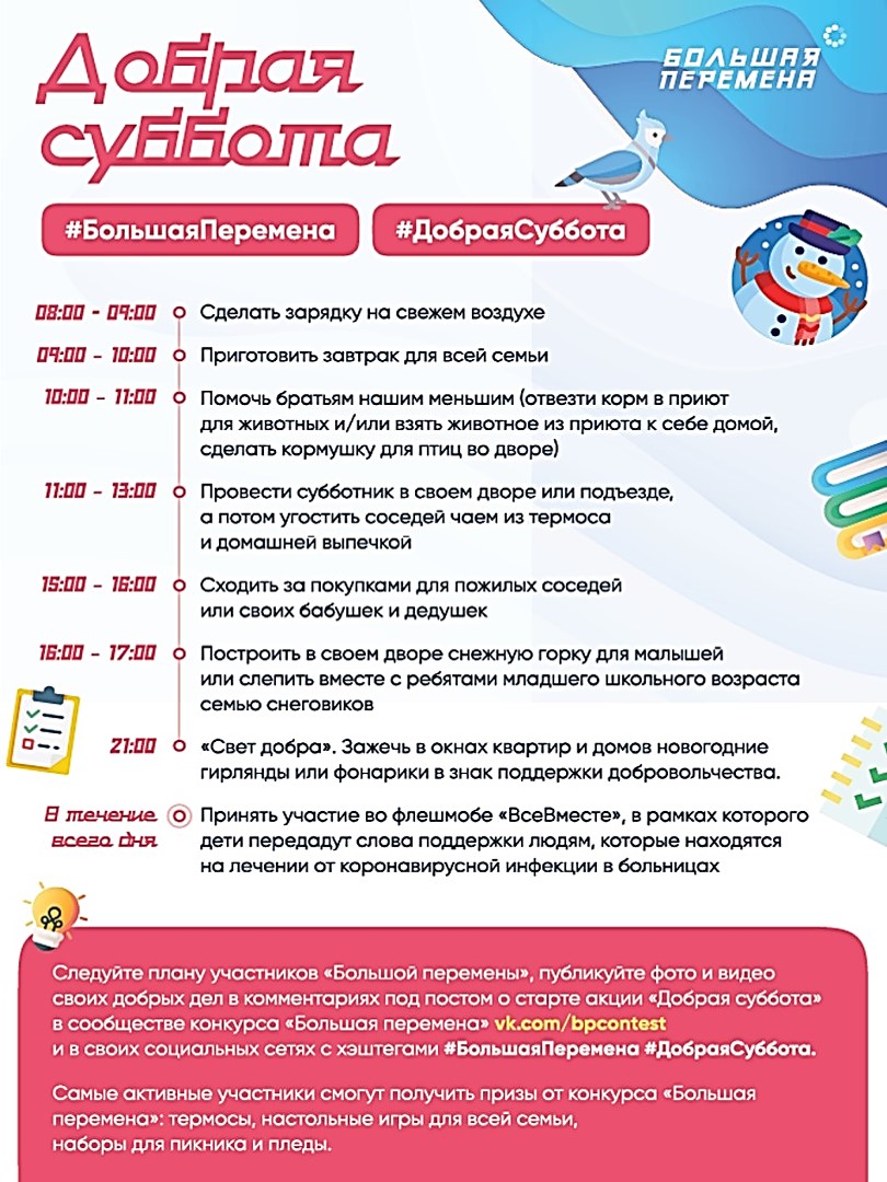 22.01.202122 января 2021 года в сообществе Всероссийского конкурса для школьников «Большая перемена» социальной сети ВКонтакте (https://vk.com/bpcontest) стартует Всероссийская акция «Добрая суббота». Инициаторами акции выступили участники «Большой перемены», они предложили всем школьникам и их родителям начать новый год с добрых дел и полезных привычек.