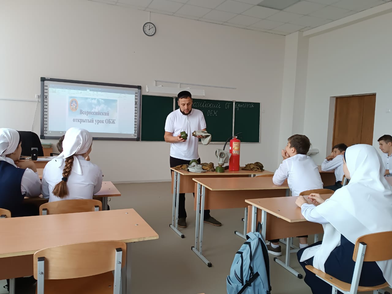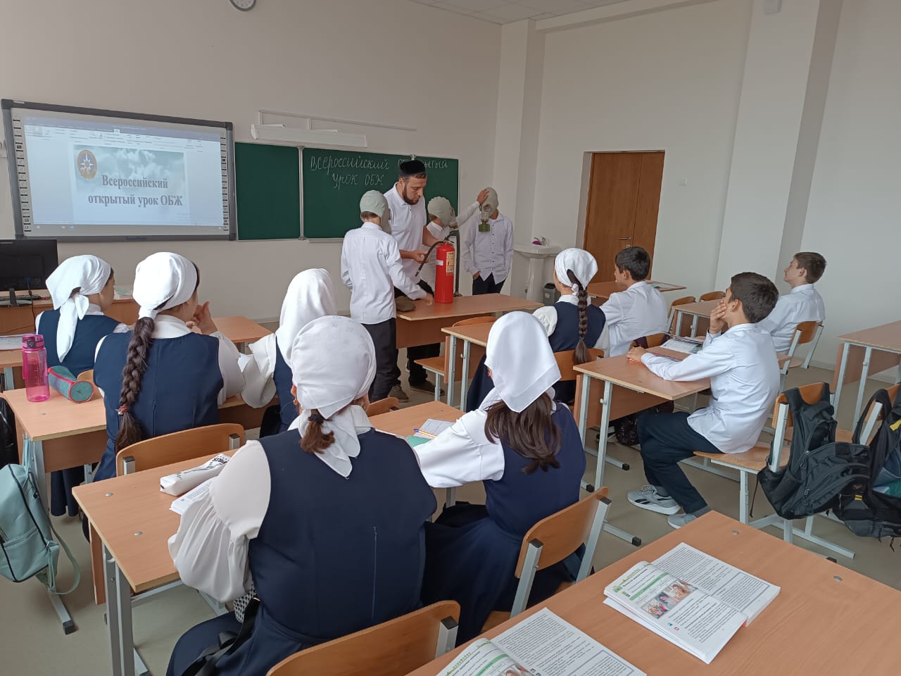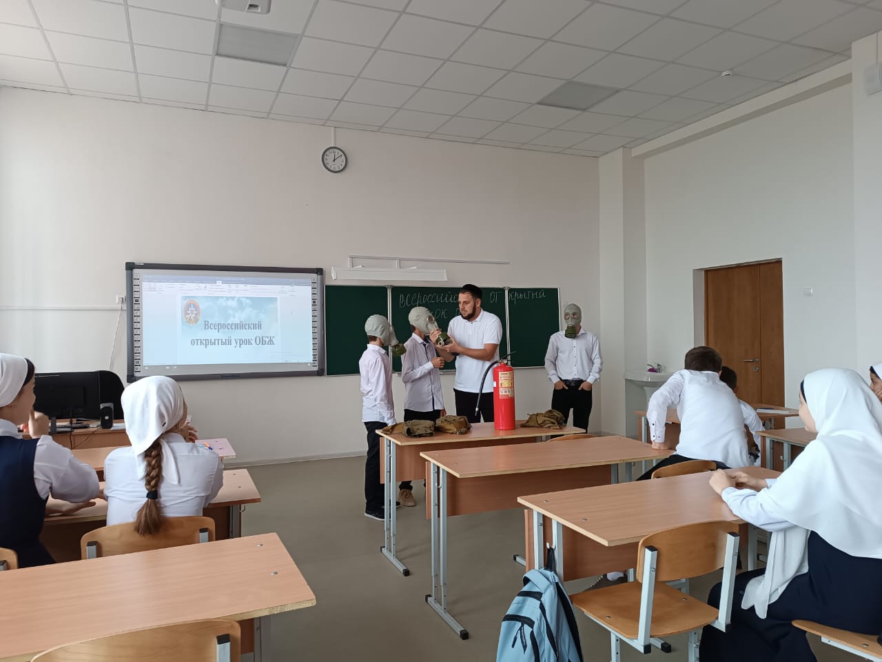 В ходе урока преподаватель ОБЖ Сулаев И.А. рассказывал детям о целях и задачах гражданской обороны, об основных составляющих системы защиты населения и территорий от чрезвычайных ситуаций, напомнил телефоны вызова экстренных служб. Учащиеся познакомились с историей возникновения гражданской обороны, узнали об основных задачах гражданской обороны по обеспечению защиты населения от чрезвычайных ситуаций мирного и военного времени, о порядке действий в случае возникновения чрезвычайных ситуаций, о способах и средствах защиты, о сигналах гражданской обороны и порядке действия населения при их получении. В ходе урока у учащихся формировались навыки применения на практике средств личной защиты – противогазов, защитный костюм, ватно-марлевую повязку, оказания первой помощи.