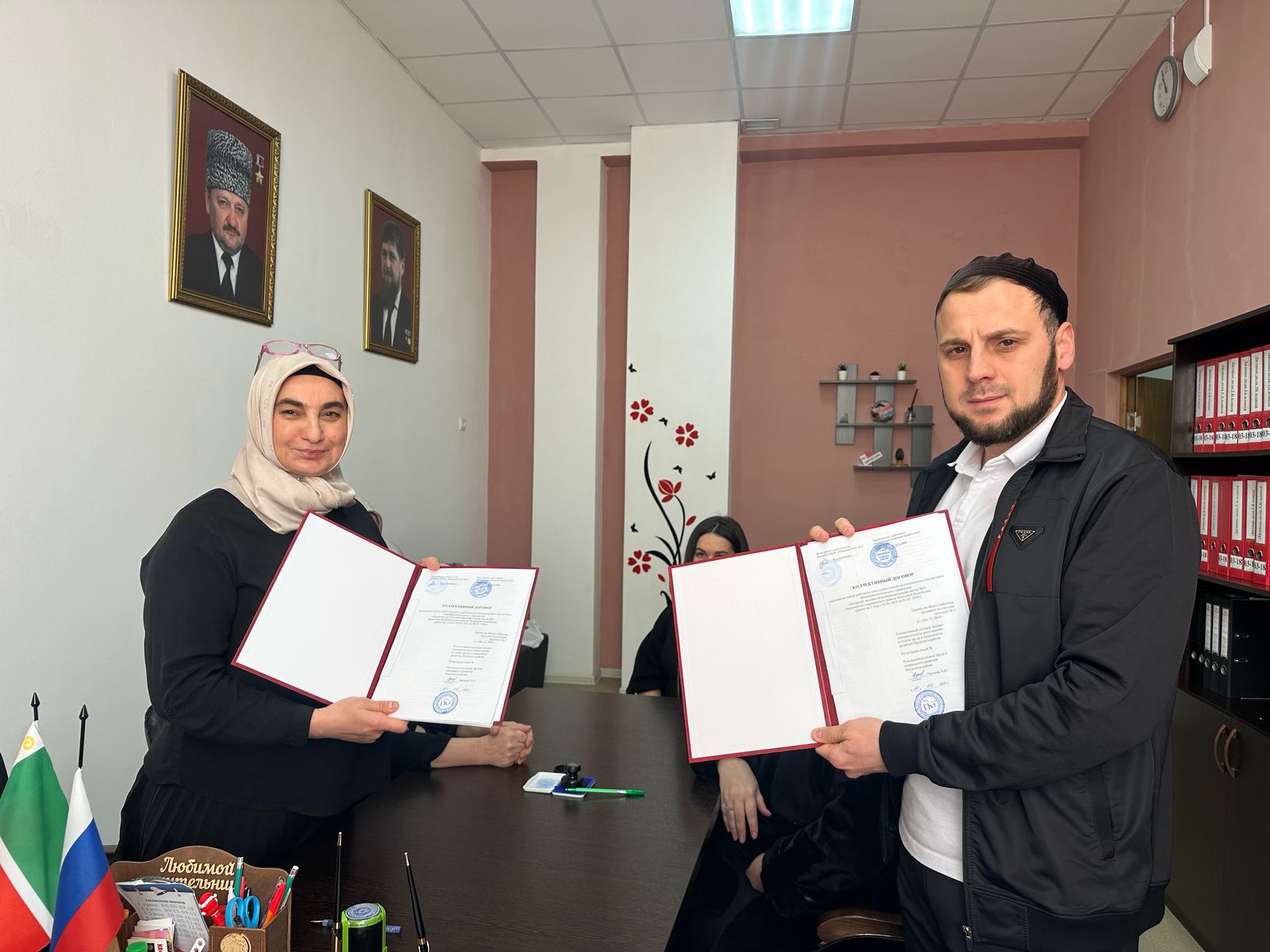 На подписании договора присутствовали заместитель представителя рессовета Профсоюза в Наурском районе Мицаева З.Х. и куратор ППО Шахидова Л. К.