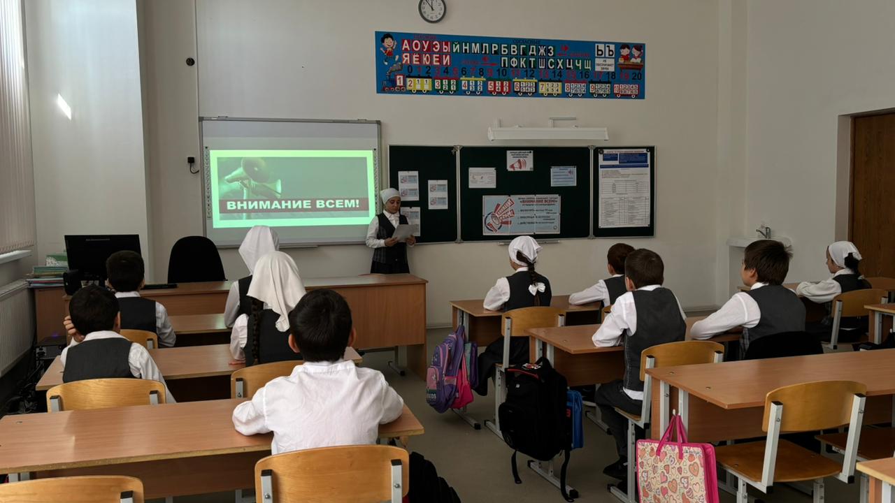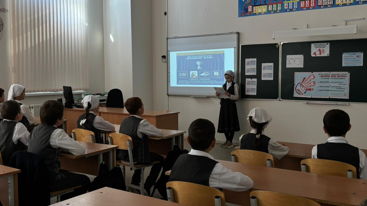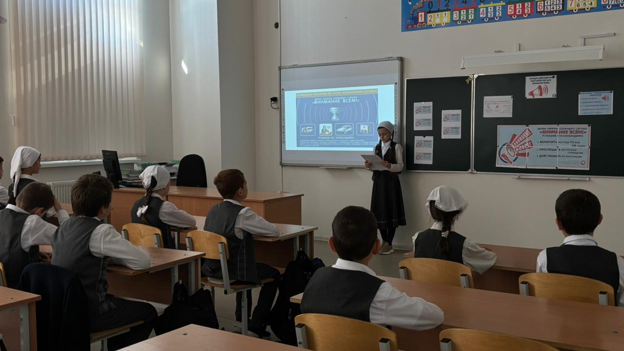В 4"А" классе был проведён классный час на тему "Внимание всем! "Цель: познакомить учащихся со значением сигнала «Внимание всем!», научить правильно действовать при звуках сирены и в чрезвычайных ситуациях, воспитывать ответственность за свою безопасность и безопасность окружающих.