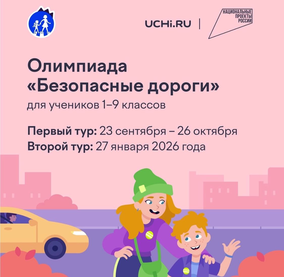 14.10.2025На Учи.ру 23 сентября — 26 октября для дошкольников и учеников 1–9 классов будет проводиться бесплатная всероссийская олимпиада «Безопасные дороги». Организаторами являются Минтранс России, ГУОБДД МВД России, Минпросвещения России, АНО «Национальные приоритеты», Учи.ру при поддержке национального проекта «Инфраструктура для жизни». Олимпиада входит в проект приказа перечня олимпиад Минпросвещения на 2025/26 учебный год. Соревнование направлено на: